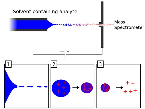 兩種主要技術(shù):硬電離和軟電離。使用硬電離技術(shù),樣品中的分子被加熱并碎裂到原子水平,提供有關(guān)分子原子結(jié)構(gòu)的信息。軟電離技術(shù),分子保持更完整,提供分子的質(zhì)量信息。該技術(shù)主要用于食品和制藥研究,過去十幾年很流行。 電噴霧離子源是一種流行的軟電離技術(shù)。EIS通過將氣體引導(dǎo)到帶電針頭旁形成氣溶膠噴霧來蒸發(fā)液體(例如來自液相色譜儀)。引導(dǎo)逆氣流通過形成的噴霧將蒸發(fā)大部分無需測量的液體,留下帶電的液滴進(jìn)入質(zhì)譜儀。 |