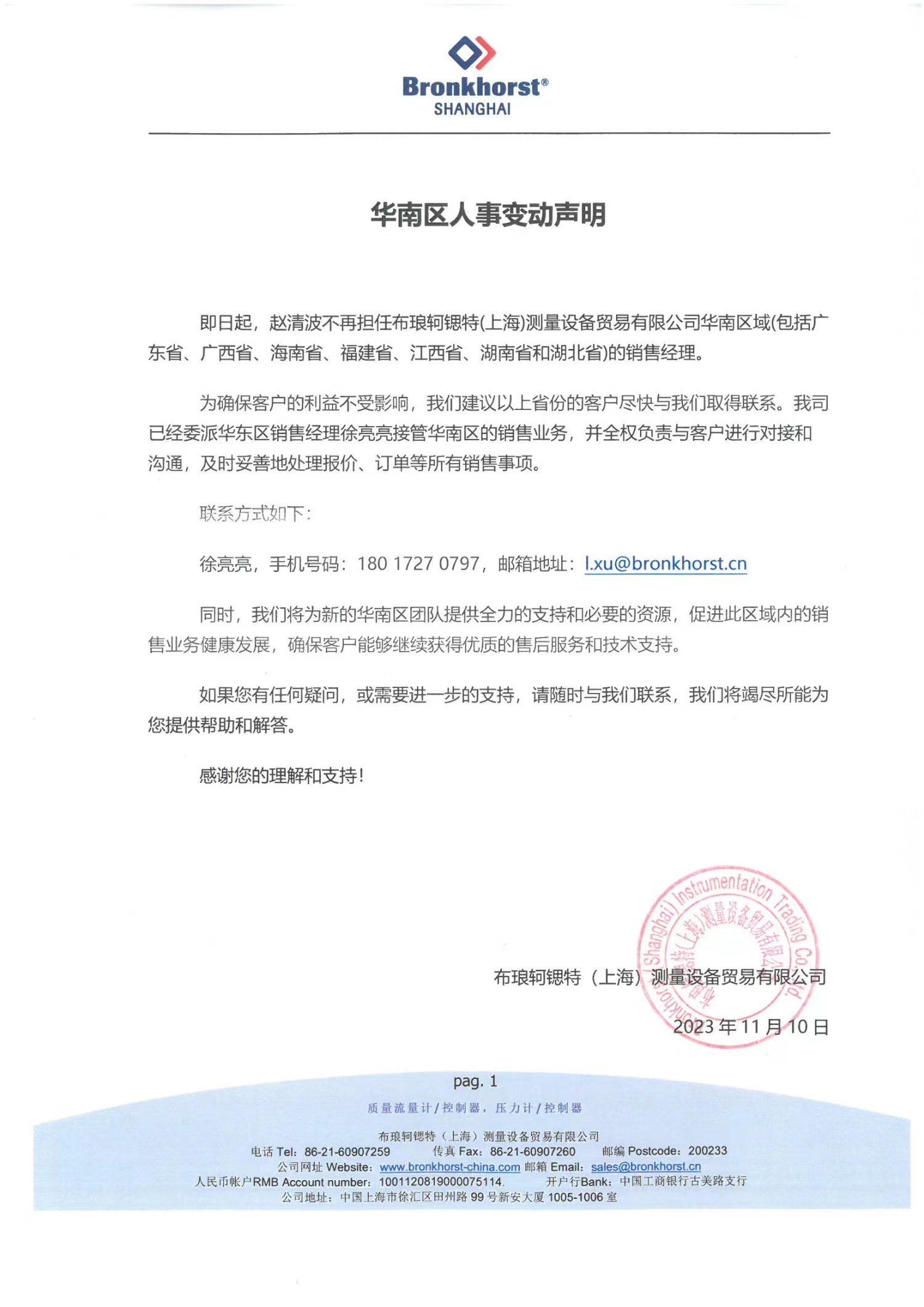 Bronkhorst華南區(qū)人事變動(dòng)聲明