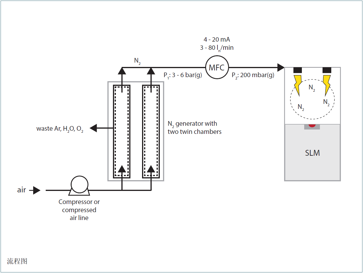 對于SLM 3D打印機(jī)的最終用戶,有兩種方式可以建立氮?dú)饪辗郑簛碜詢?nèi)部的氮?dú)夤?yīng)源(如果存在),或是作為3D打印機(jī)附件的氮?dú)獍l(fā)生器。Bronkhorst參與到了后一個(gè)選擇中。來自壓縮空氣源或者壓縮機(jī)的加壓空氣被供給到氮?dú)獍l(fā)生器,其分子篩將空氣流分成兩股流。除去氧氣、水蒸氣和氬氣等成分,保留高純度(5.0級)的氮?dú)狻?/p>