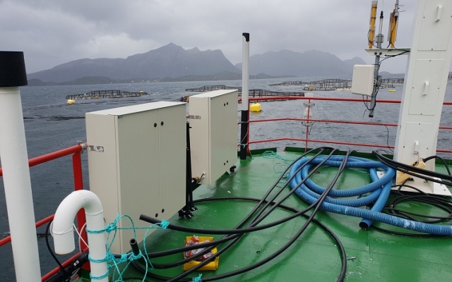 質(zhì)量流量控制器通過客戶計(jì)算機(jī)上定制的人機(jī)界面,使用PLC和Modbus通信協(xié)議進(jìn)行遠(yuǎn)程控制。該計(jì)算機(jī)置于陸地上的指揮中心,信號(hào)通過移動(dòng)4G網(wǎng)絡(luò)發(fā)送到靠近籠子的峽灣之間的海上給料筏。壓縮機(jī)位于給料筏的腹部,帶有質(zhì)量流量控制器的柜體在甲板上。指揮中心的遠(yuǎn)程控制允許在喂魚時(shí)停止通氣,意味著控制喂魚的人也可以控制通氣。這是一大進(jìn)步。通常情況下,不希望在魚兒進(jìn)食的同時(shí)使用曝氣。